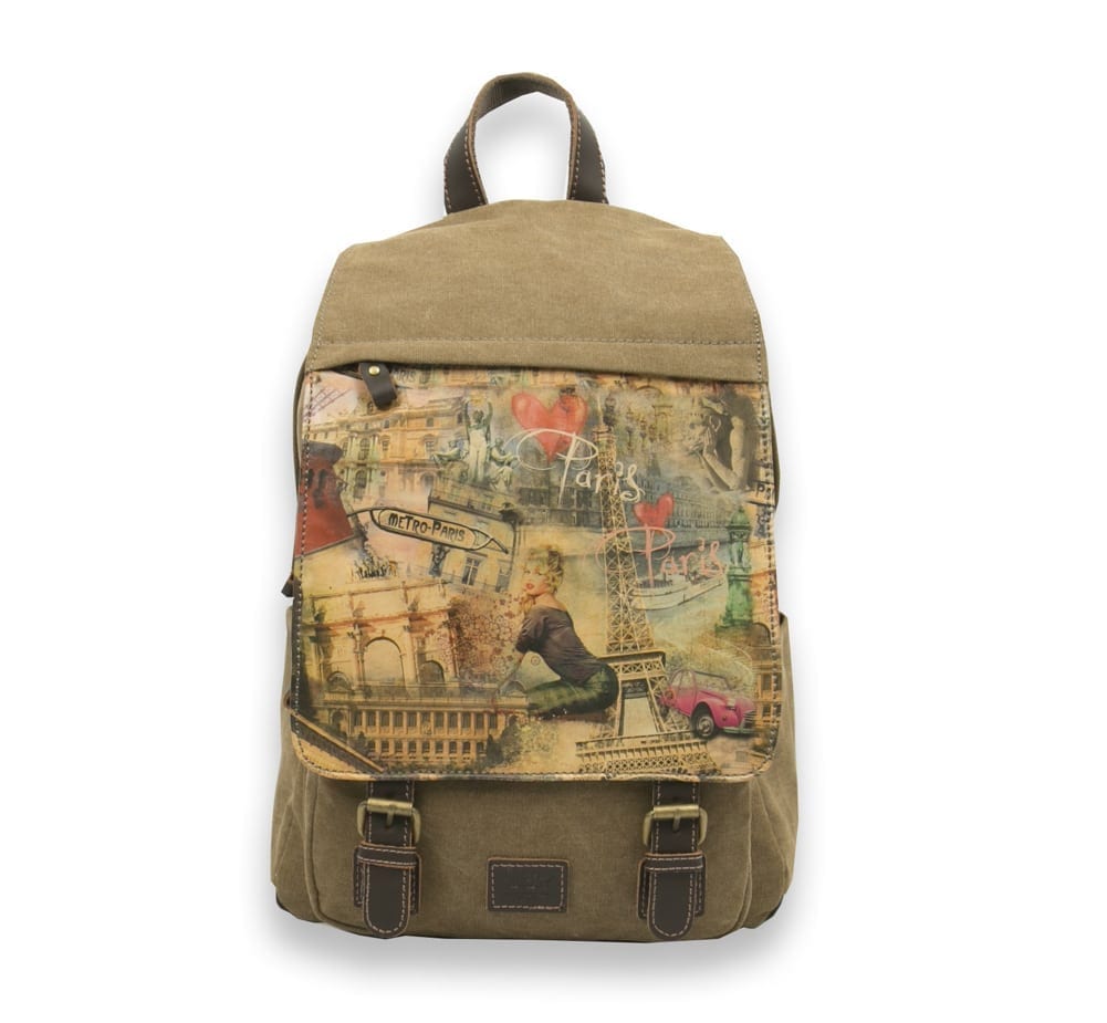 • Zipped main compartment covered by a front flap with magnetic button closures;